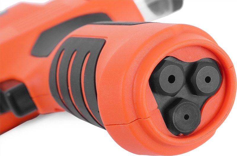 - Специальные пазы для хранения сменных насадок для вытяжных заклепок в рукоятке есть: замена наконечника для установки другого диаметра вытяжных заклепок становится по настоящему простой – не нужно искать кейс, ключи и сами наконечники, достаточно открутить наконечник с помощью контейнера (колбы), установить на его место нужный размер и продолжить устанавливать вытяжные заклепки
