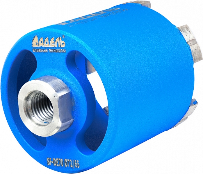 Алмазная коронка с пылеудалением для подрозетников по железобетону Адель Super Fast SF DE-D70 SDS-Max 72/65 мм (Adel Супер Фаст СФ ДЕ-Д70 СДС-Макс 72/65 мм) с адаптером М16 – SDS-Max, центровочным твердосплавным сверлом и клином предназначена для скоростного сверления железобетона (армированного бетона), бетонных блоков, газобетона, кирпича и других строительных материалов с использованием ручного электроинструмента без охлаждения водой.
