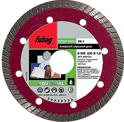 Алмазные диски по камню Fubag SK-I (Фубаг СК-И) предназначен для резки твердого искусственного камня, керамогранита, гранитных плит, керамики, пластика и других строительных материалов на плиткорезных и камнерезных станках, как с водяным охлаждением, так и без него.