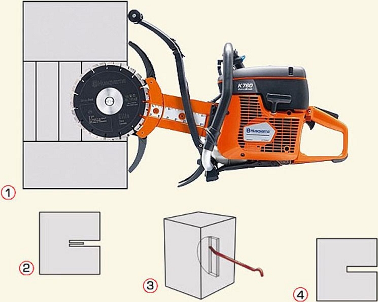 Метод резки Cut-n-Break разработан специально для работ, при которых требуется выполнить глубокую резку при ограниченном бюджете. Ручной бензиновый резчик Husqvarna К760 Cut-n-Break позволят осуществлять рез глубиной до 400 мм с одной стороны. Сдвоенные диски делают двойной рез, выделяя простенок, который в последствии удаляется с помощью прилагаемой фомки. И так, шагами Вы двигаетесь вглубь разрезаемого материала. Поставляется в комплекте с дисками и фомкой.