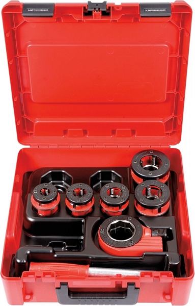 Клупп трубный ручной Rothenberger Super Cut Set BSPT R 1/2"-3/4"-1" (Ротенбергер Супер Кат Сет БСПТ Р 1/2"-3/4"-1") с трещоткой предназначен для нарезки правой конической трубной резьбы BSPT R на трубах Ø 1/2", 3/4", 1". Применяется для изготовления точных и надежных резьбовых соединений в соответствии с EN нормами 10226 на стройплощадках и в мастерских, а также в труднодоступных местах.