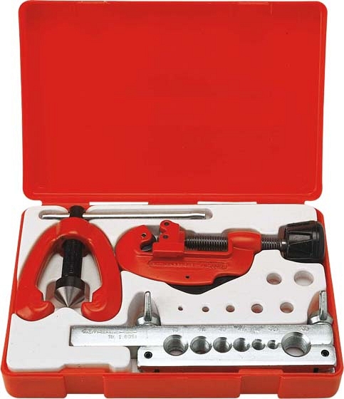 Набор для резки и развальцовки труб Super-Ego EB 4-4,75-6-8-10-12-14 мм (Супер-Эго ЕБ 4-4,75-6-8-10-12-14 мм) предназначен для резки труб Ø 3 – 30 мм (1/8" – 1 1/8") и развальцовки труб Ø 4, 4.75, 6, 8, 10, 12, 14 мм, под углом 45° (изготовления точных, качественных, простых одинарных и двойных (с дополнительными насадками!) бортиков), из меди, латуни и алюминия, при монтаже систем водоснабжения, газоснабжения, отопления, кондиционирования и в холодильной технике.