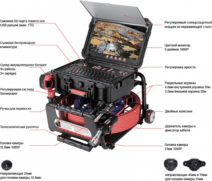 - Головка камеры Ø 12,8 × 21 мм и проталкиваемый кабель Ø 4,8 мм × 30 м из стекловолокна со счетчиком длины и системой торможения, подходящие для труб Ø 32 – 65 мм, длиной до 30 м
